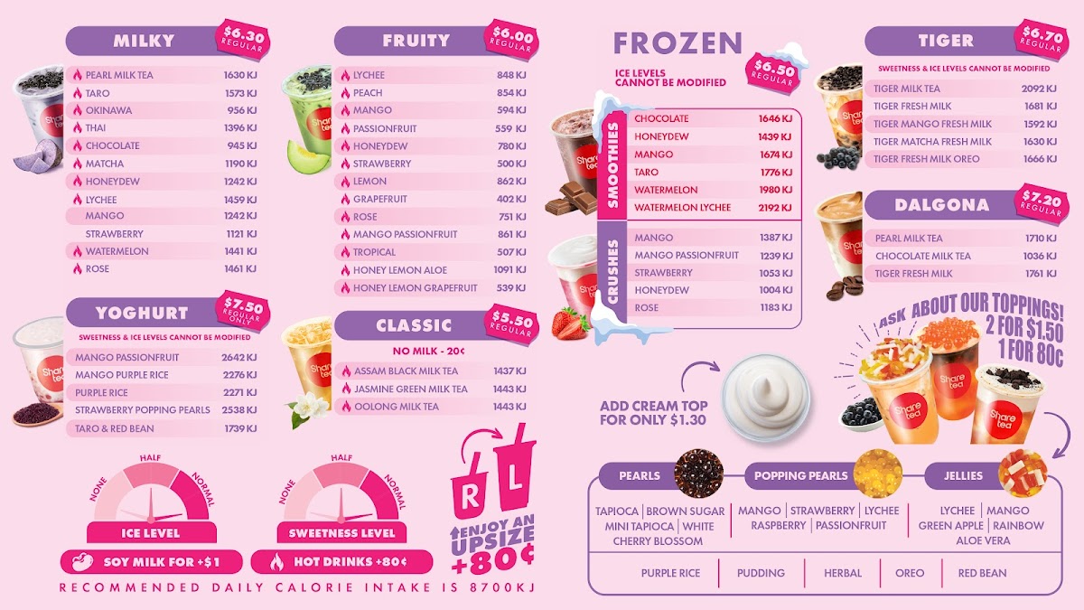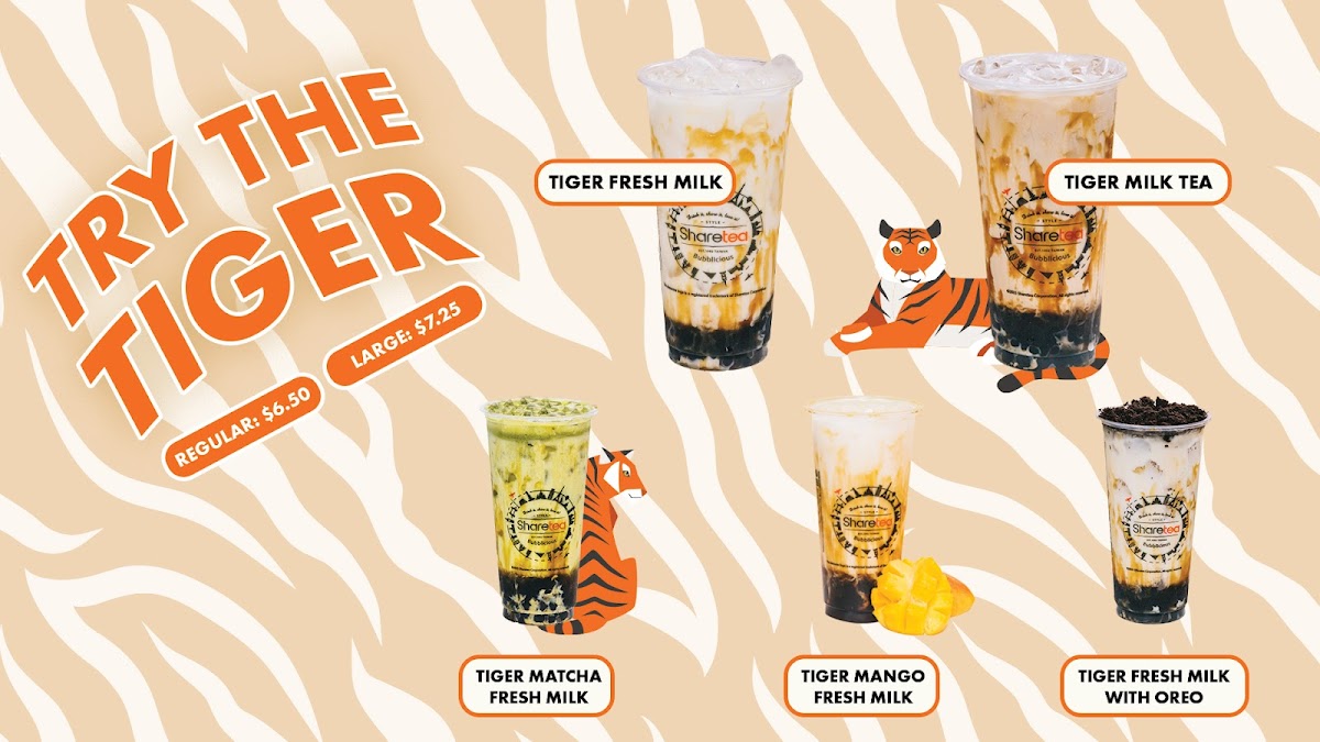 The menu at Sharetea Carindale offers an extensive selection of beverages and treats, ensuring there's something for every taste. For those looking to try something new, the Large Matcha Rose Milk Tea is a standout addition. If you're in the mood for something milky, options like the Large Honeydew Milk Tea and Large Taro Milk Tea provide creamy, flavorful choices. The Large Tiger Mango Fresh Milk and Large Tiger Fresh Milk Oreo from the Tiger series offer a bold twist on classic drinks. Yogurt lovers can indulge in options like Grape And Grape Jelly Yoghurt and Mango Passionfruit Yoghurt, each with unique, refreshing flavors. The Large Mango Fruit Tea and Large Peach Fruit Tea from the Fruity range are perfect for those craving something light and fruity. For a more adventurous taste, the Large Guava Passionfruit Fruit Tea and Large Watermelon Lychee Fruit Tea in the Fruity Fusions category offer a delightful blend of flavors. The Smoothie section features indulgent options like the Large Matcha Smoothie and Large Tiramisu Smoothie With Coffee Jelly, perfect for a creamy and satisfying treat. There’s also a selection of fresh teas, such as the Large Assam Black Fresh Tea and Large Jasmine Green Fresh Tea, ideal for those looking for a more traditional tea experience. Coffee enthusiasts will appreciate the Large Americano and Large Mocha Tea, while the Hot menu offers comforting drinks like the Hot Assam Black Fresh Tea and Hot Rose Fruit Tea. For younger customers, there’s a dedicated Kids’ Drinks menu, featuring options like the Kid's Tiger Mango Fresh Milk and Kid's Lychee Fruity. Finally, Sharetea Carindale also offers fun merchandise like reusable cups and key rings for fans to take home. With such a diverse and delicious menu, there's no shortage of choices to enjoy at this local favorite.
